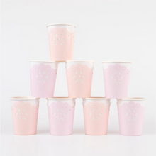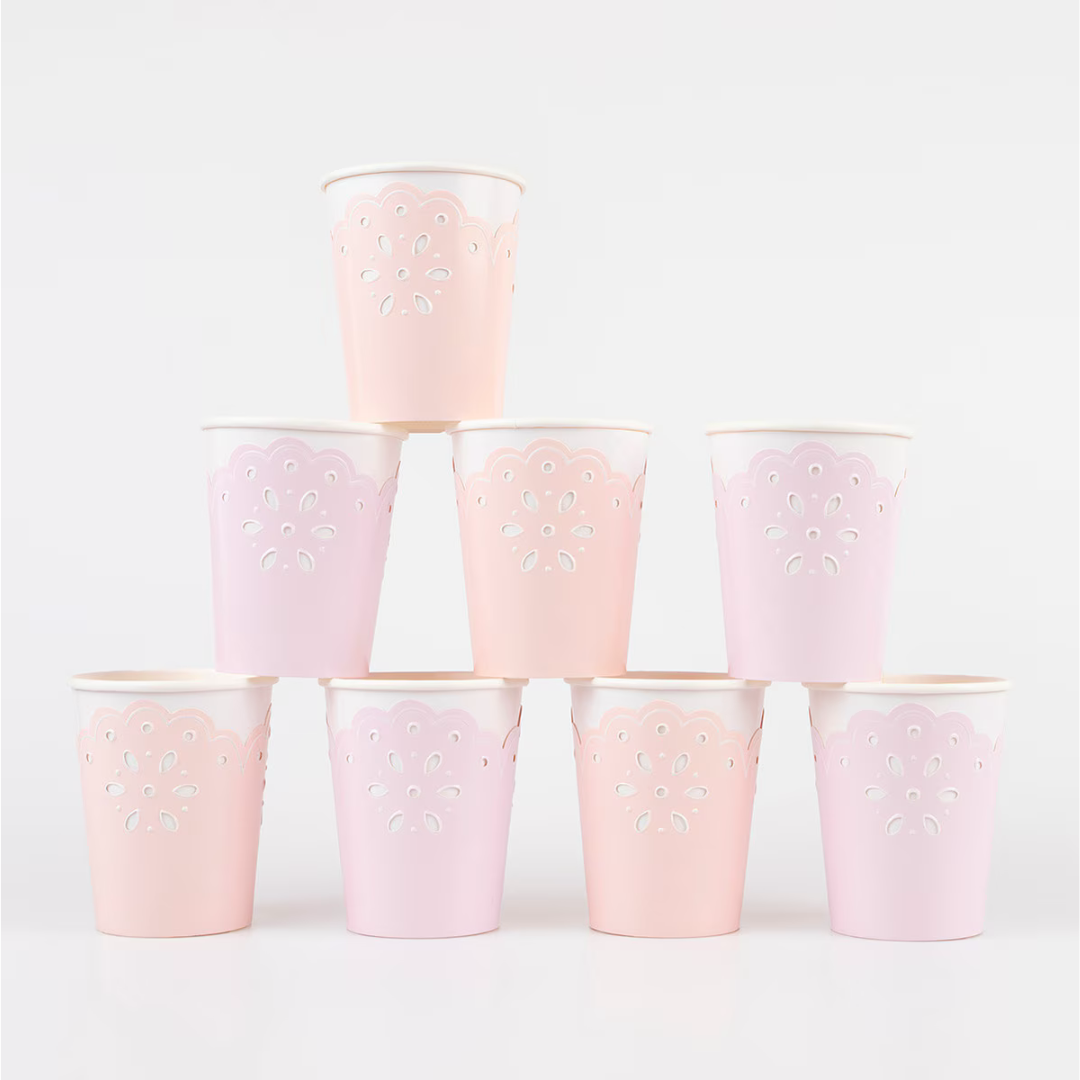 - This pretty party range is inspired by broderie anglaise, a delicate lace eyelet embroidery design that is back in style. Teamed with pink and peach colors and embossed details, this is the perfect range for bridal showers and baby showers. These paper cups are ideal for serving special hot or cold party drinks in.