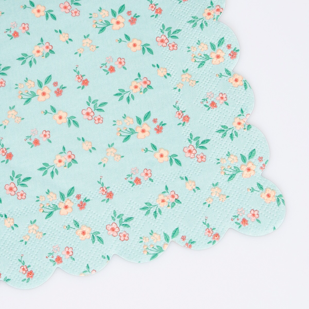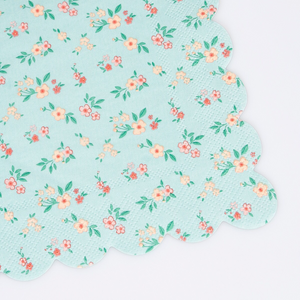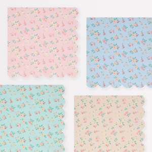 - Ditsy floral clusters add effortless elegance to any setting. This classic design is influenced by fashion-forward floral pattern trends, with a scalloped border for a stylish look. The four different vintage color ways, of pink, peach, mint and blue, in this large napkin set are perfect for afternoon tea, garden parties, bridal showers or baby showers.