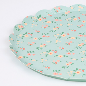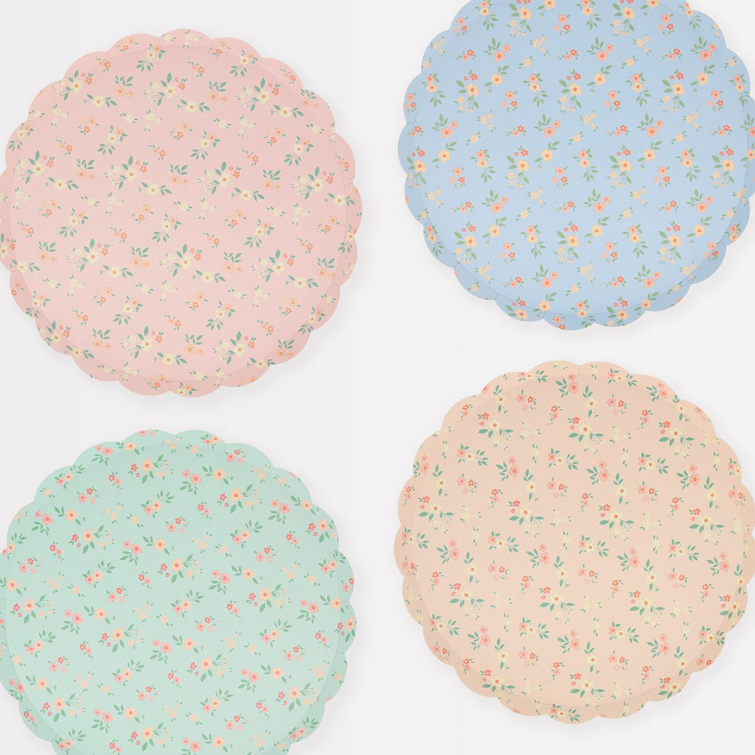 - Ditsy floral clusters add effortless elegance to any setting. This classic design is influenced by floral pattern trends, with a scalloped border for a stylish look. The four different vintage color ways, of pink, peach, mint and blue, in this paper plate set are perfect for afternoon tea, garden parties, bridal showers or baby showers.